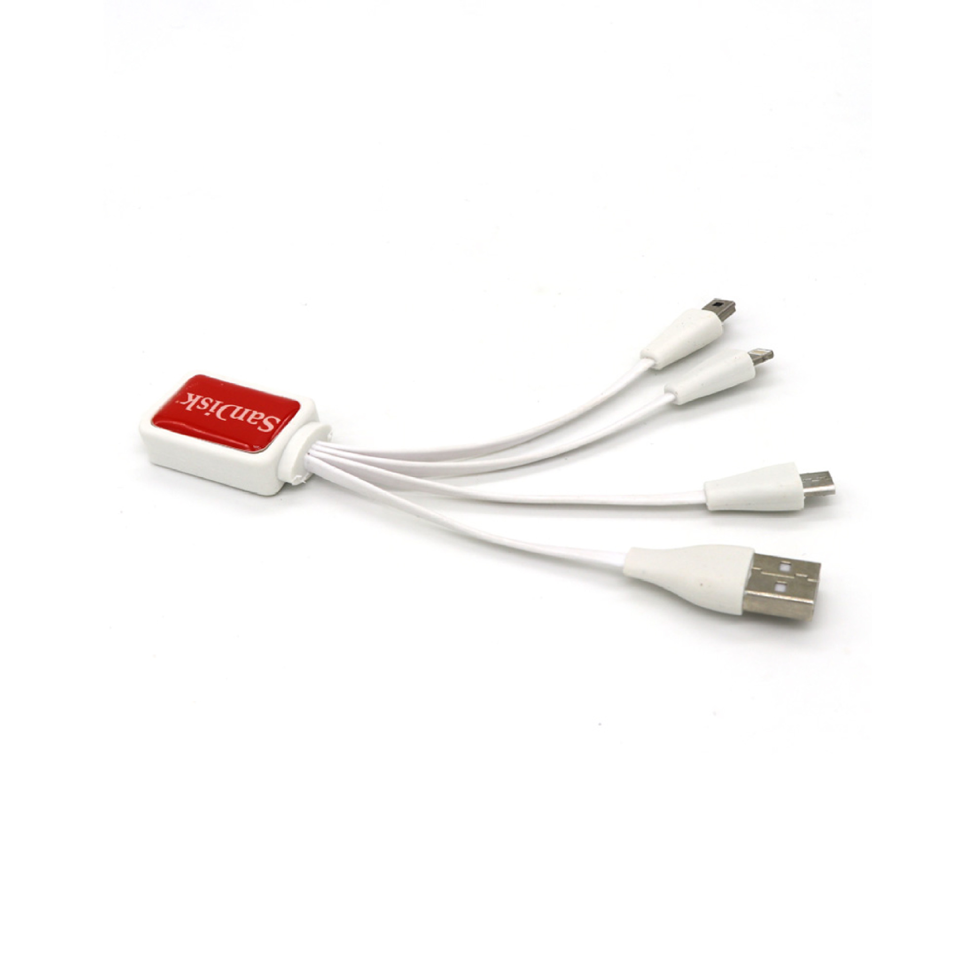 This multiple USB charger cable is a handy tool to carry. Features a plastic handle, keeping all of the cords together neatly. Includes a Type C, Apple Lightning, Micro, Mini and a USB connector, compatible with iPhone, iPad, Android and most other electronic devices. It allows you to feature up to 6 different connectors of your choice. It can be used in your car, travel, journey, home, office. Your logo can be printed at the head of the cable. Custom packing is available.